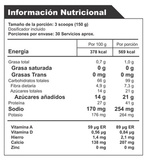 | INGREDIENTES | Maltodrextrina, proteína aislada de soya, saborizante nat. (vainilla), saborizante art. (vainilla), creatina monohidratada, extracto de malta en polvo, proteína de suero lácteo, crema no láctea, saborizante art. (azúcar y tiramusú), estabilizante (goma xantana), vitaminas (vitamina A, vitamina C, vitamina B6, vitamina B2, vitamina B1, vitamina B3, vitamina B5, vitamina B12). CONTIENE DERIVADOS DE SOYA Y DERIVADOS LÁCTEOS. |