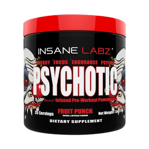 PSYCHOTIC es un pre-entrenamiento que te brinda energía extrema, enfoque y rendimiento. ENERGÍA. ATENCIÓN. AGUANTE. FUERZA. Si tiene un aumento sustancial de energía y fuerza que continúa mucho después de que finaliza su entrenamiento, Insane Labz PSYCHOTIC es la única opción. Cargado con Beta-Alanina, Monohidrato de Creatina, Hordenina HCI y DMAE para aumentar la resistencia y la concentración para superar los entrenamientos más duros. NO CRASH FORMULADO. Psychotic está formulado para una energía, concentración y resistencia duraderas que lo mantienen activo y sin nerviosismo. MEJOR DEGUSTACIÓN: ¿Con qué frecuencia prueba un pre-entrenamiento e inmediatamente quiere tirarlo a la basura? Psychotic tiene los 8 sabores con mejor sabor de cualquier pre-entrenamiento y realmente no está cerca. Los suplementos de pre-entrenamiento no son un lujo; son un requisito si desea alcanzar sus niveles máximos de rendimiento durante cada entrenamiento. Cuando se trata de aumentar tu enfoque, rendimiento y resultados, el pre-entrenamiento, Psychotic está repleto de la combinación correcta de ingredientes científicamente probados para asegurarte de que vas más allá. ¿Qué es el Psychotic? Psychotic es un suplemento a base de estimulantes que se usa de 20 a 30 minutos antes de su entrenamiento. Está cargado con varios ingredientes de alto octanaje que se ha demostrado que brindan una serie de beneficios de acondicionamiento físico, entre los que se incluyen el aumento de energía, una mayor potencia de resistencia y una mayor resistencia. Se ha demostrado que esta fórmula única dura hasta tres horas, lo que la hace ideal para cualquier entrenamiento. También se considera un suplemento nootrópico ya que promueve el rendimiento y la función cognitiva. Con ingredientes como Huperzine A, notará un aumento inmediato en su tiempo de reacción y estado de alerta general. Aunque es un suplemento pre-entrenamiento, Psychotic puede ser ideal para los siguientes tipos de personas. Obviamente, aquellos que desean un impulso adicional en su rendimiento deportivo se beneficiarán. Perfectamente formulado para aumentar efectivamente la energía mental y física, Psychotic será un regalo del cielo para cualquier entrenamiento duro. Ya sea que estés tratando de desarrollar músculo, perder peso o ganar fuerza. ¿Tu primera clase en la universidad comienza a las 7 a.m.? ¿Te encuentras quedándote dormido antes de que el mediodía se acerque? Armado con nootropic, o ingredientes que estimulan el cerebro, Psychotic puede ayudarlo a mantenerse despierto durante las clases mientras mejora su rendimiento cognitivo. Es posible que descubra que está más concentrado y es capaz de recordar información cuando usa Psychotic antes o durante la clase. Uso sugerido:- Tomar 1 servicio con 250-300ml. de agua 30 minutos antes del ejercicio.